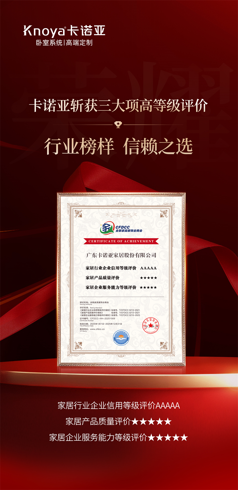近日,全联家具装饰业商会公布家居行业企业相关评价结果,广东卡诺亚家居股份有限公司凭借在信用建设、产品质量与服务能力的综合优势,一举斩获家居行业企业信用等级评价AAAAA、家居产品质量评价★★★★★、家居企业服务能力等级评价★★★★★三项高等级评价认证,进一步佐证了卡诺亚在信用、品质与服务层面的综合竞争实力,是消费者的信赖之选。