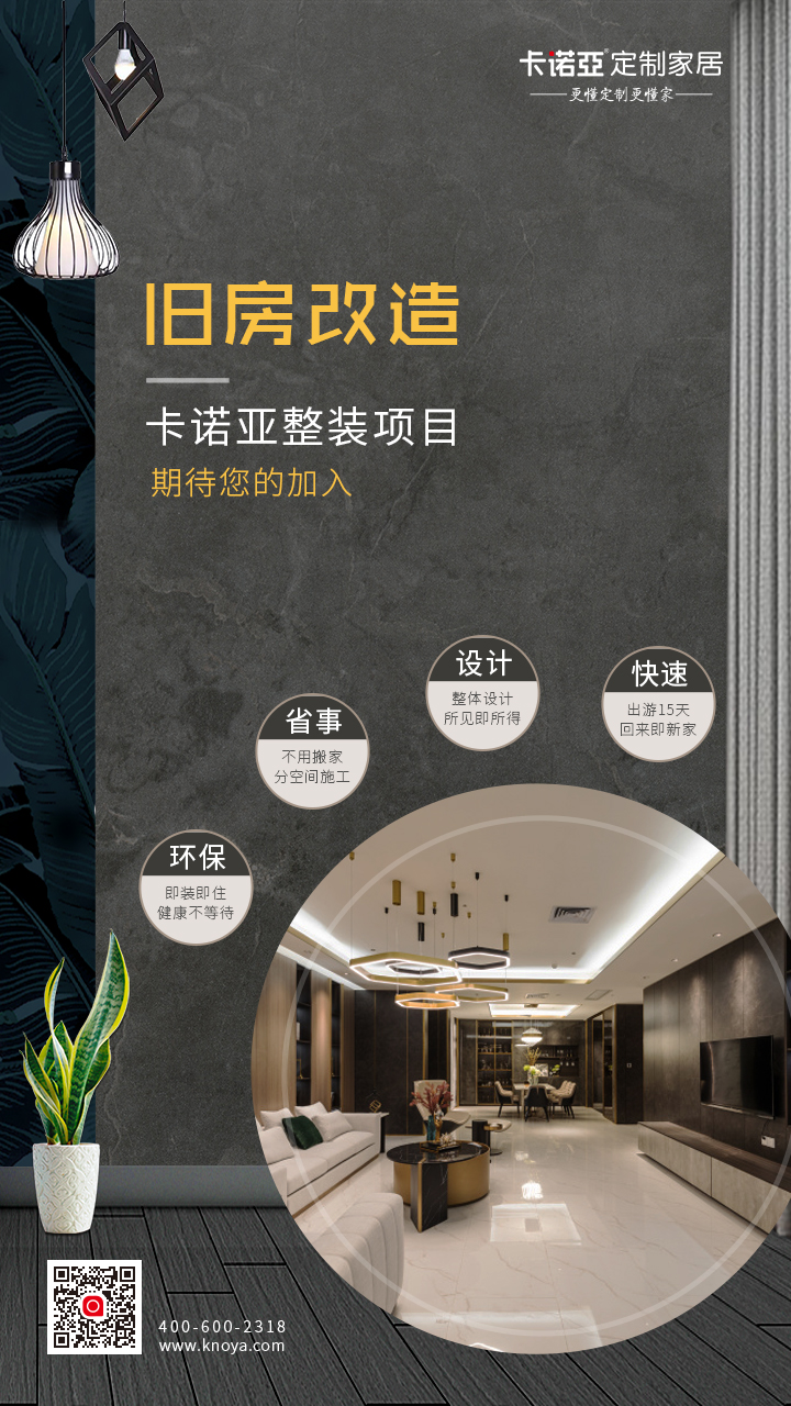 “卡诺亚”,早在2020年1月10日举行的“凝心聚力,智造未来”卡诺亚定制家居2020迎新年会上,公司董事长兼总经理程国标先生在致辞中就曾经提到卡诺亚将全面推进整装、拎包入住、旧房翻新、大宗采购等业务,从而提升企业和经销商的利润空间,而突如其来的疫情则加速了卡诺亚在旧房翻新领域的投入与布局,并根据房主需求,为其量身定做局部改造+全屋空间定制的方案,推动旧房焕新颜。根据反馈,这种改造方式已经得到业主的一致认可。