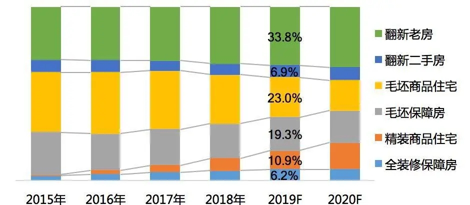 事实上,趋势早已显现。权威调研数据显示,从住宅装修市场的产值结构来看,老房及二手房翻新市场在2019年合计占比超过40%,2020年将超过42%。而毛坯商品住宅市场的比重持续下降,2019年预计略低于23%,2020年可降至17.6%,毛坯房市场在2020年也将低于37%。由此,存量房翻新超过毛坯房市场产值规模的时代将继续深化。