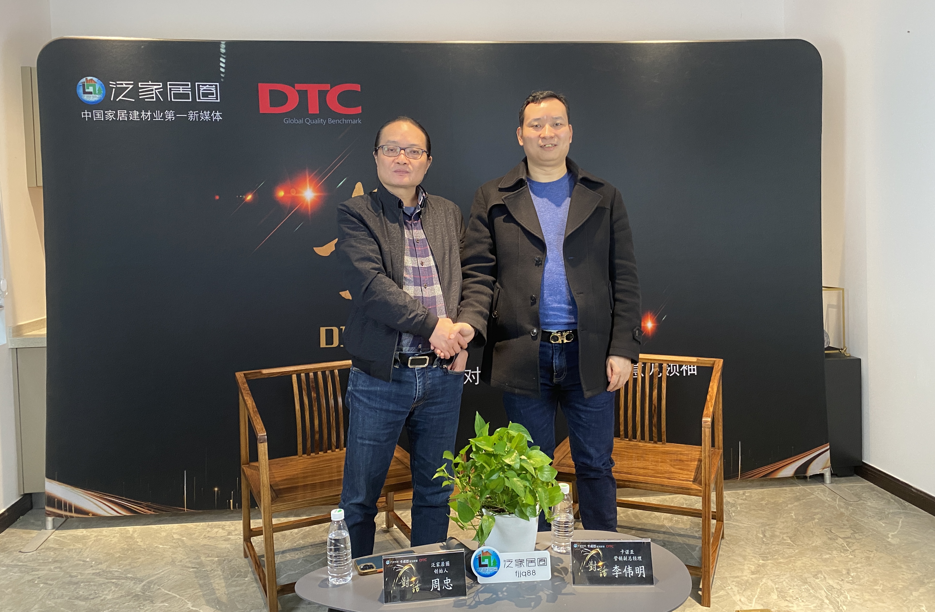 图为泛家居圈周忠(左)与卡诺亚整家定制营销副总经理李伟明(右)