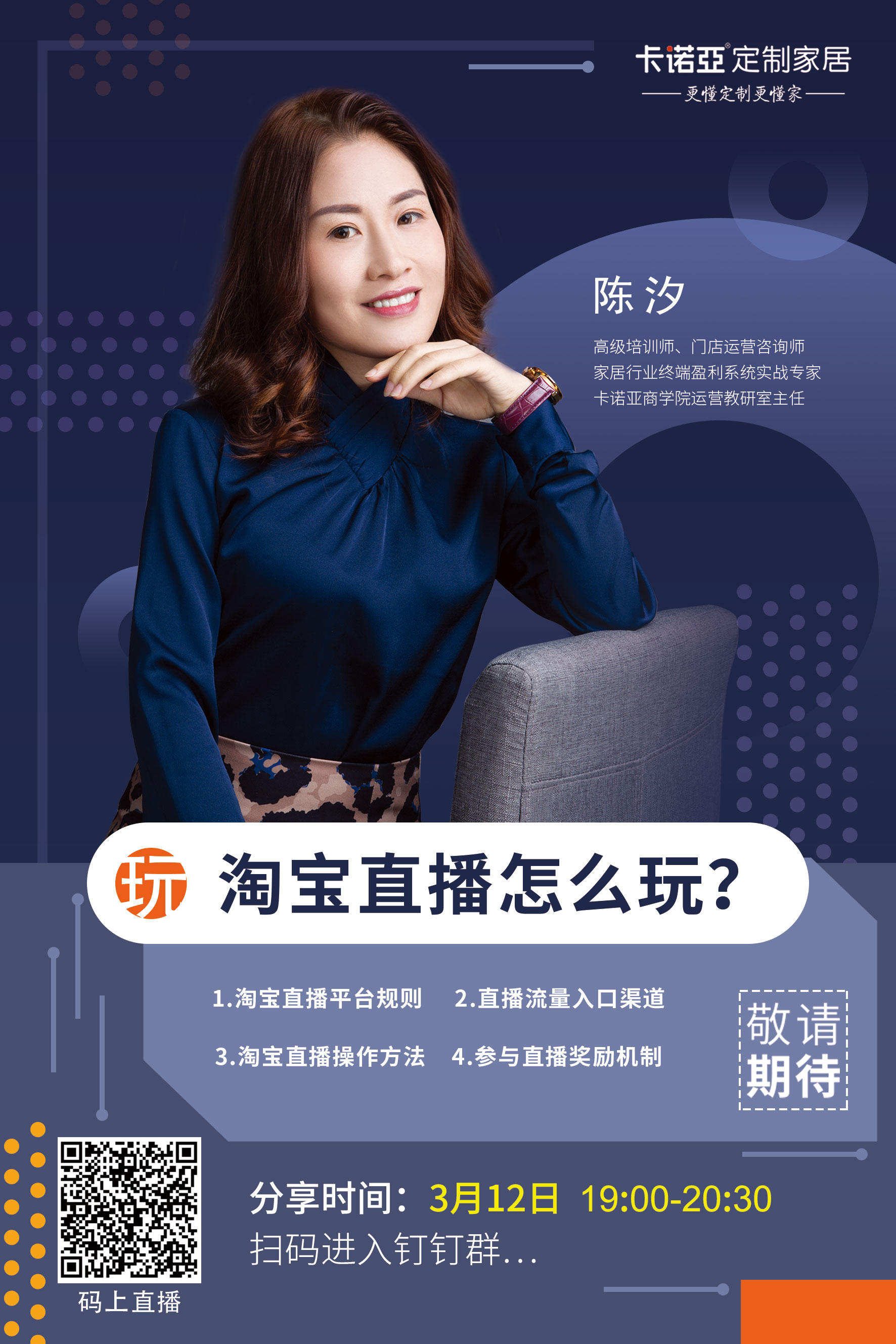 据悉,为了让经销商更快熟悉淘宝直播这一新零售模式,转变经营意识,从线下实体店开始转变为利用互联网进行经营,卡诺亚商学院金牌导师推出超级主播训练营,手把手传授,助力门店掌握直播营销技能,培训期间通过钉钉学习群同步开展直播授课,学员报名人数众多,场场爆满,获得点赞无数。