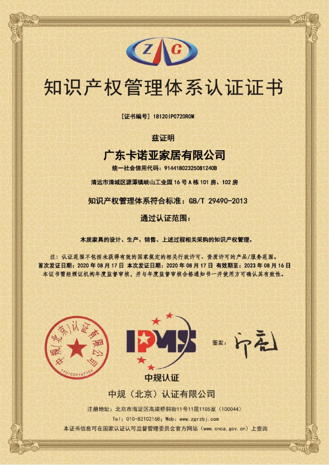 近日,经层层严格的内审、外审,作为高新技术企业的卡诺亚,顺利通过中规(北京)认证有限公司的审核,其知识产权管理体系完全符合国家关于企业知识产权管理规范的要求。获此认证,表明卡诺亚在推进公司知识产权管理规范化方面获得重要认可,综合竞争力进一步提升,对企业健康可持续发展带来深远影响,也为中国定制家居行业推进知识产权管理体系建设树立了标杆。