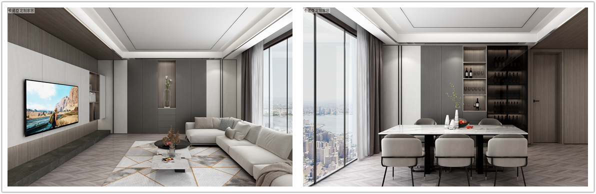 卡诺亚“银丝木”大面积运用,“慕尼黑”格栅门板作为点缀,搭配米色的沙发和白色大理石餐桌,整个空间硬朗有张力,凸显现代都市生活注重快节奏与简洁实用。