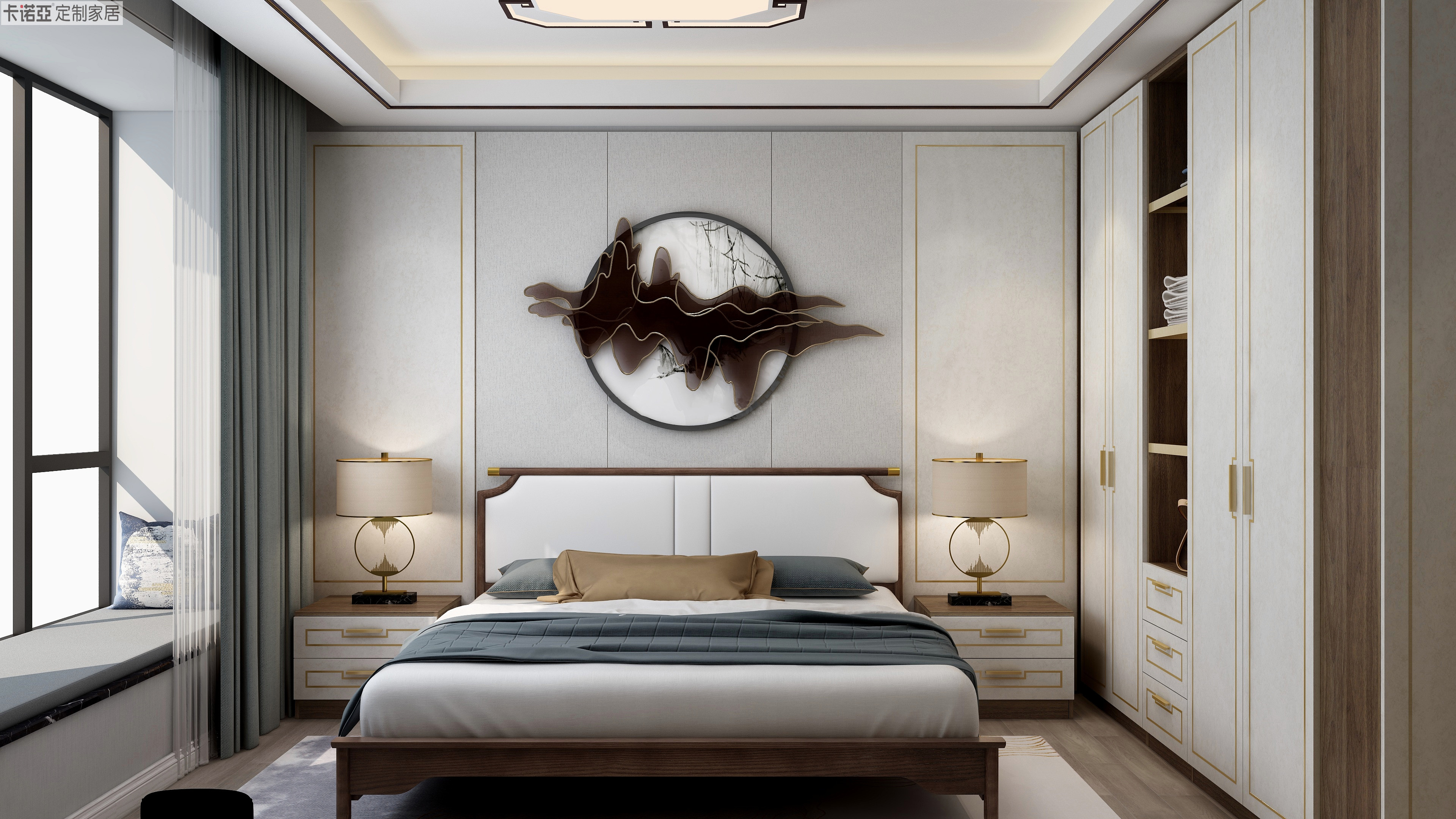 米色成为空间的主色调,辅以木纹材质,自然而舒适,营造良好的睡眠环境。回纹型金属条及黄铜色拉手点缀空间,尽显新中式风格的轻奢观感。