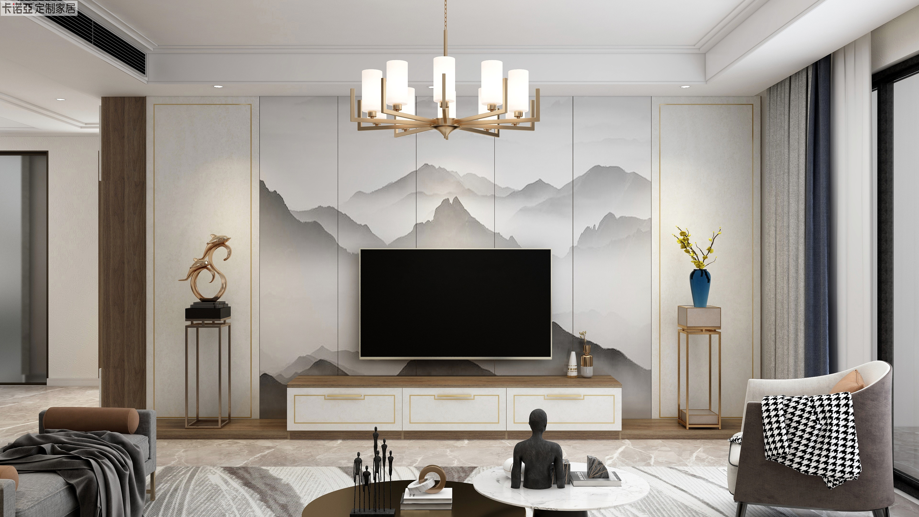3D中式山水画作为电视背景墙,让人耳目一新。搭配侧边对称的护墙板,采用回纹型金属条的金边勾勒,于无声处惊鸿一瞥,营造意境悠远的东方禅意空间。