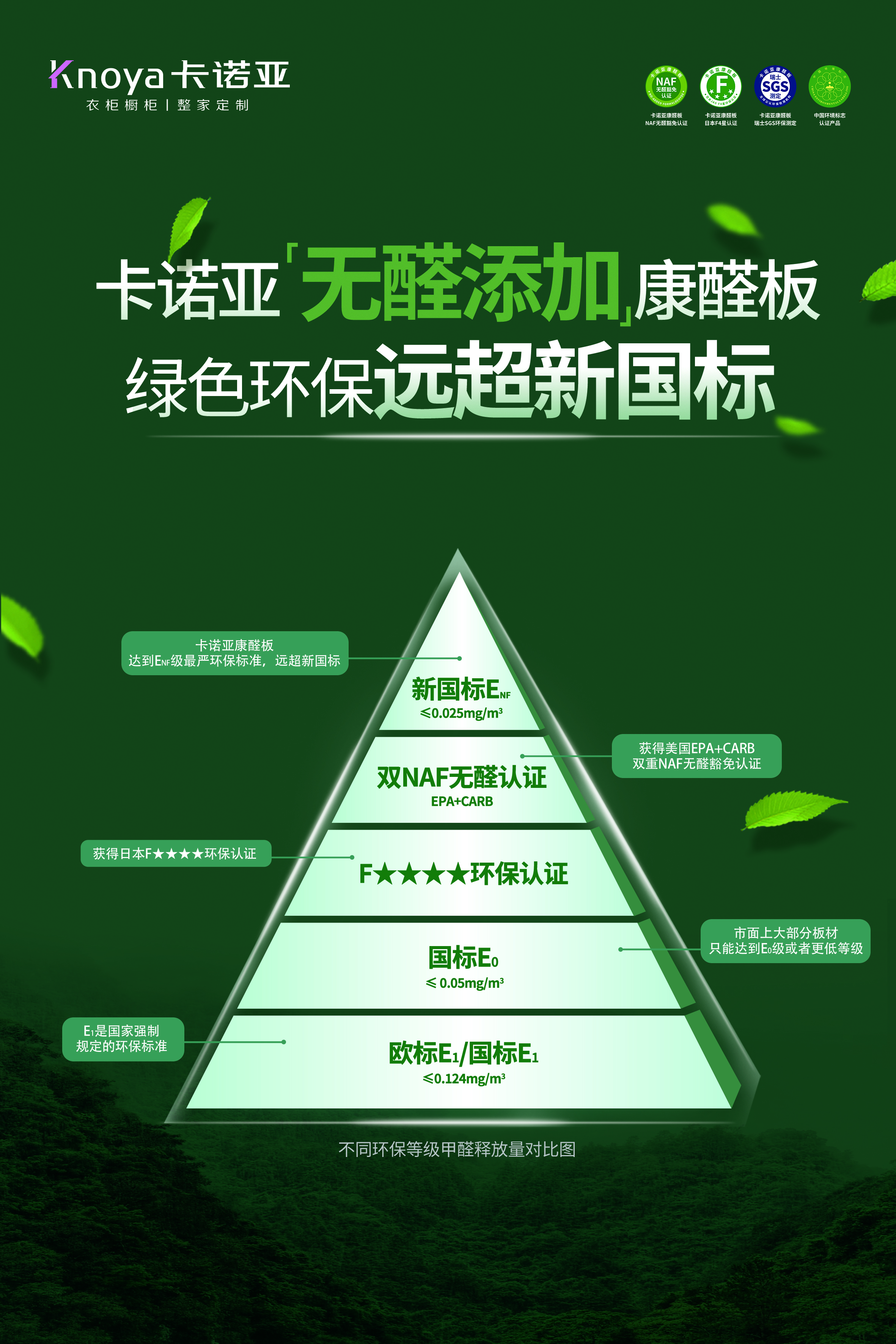 卡诺亚除了在生产端融入绿色发展基因,还在消费端积极引导普及绿色环保家居理念。在全国近千家品牌专卖店,卡诺亚大力普及高颜高品康醛整家套餐,以更具性价比的优势,让健康家居走进更多的家庭。基于消费者对环保健康的高需求,卡诺亚康醛整家套餐选用的是达到新国标最高环保等级ENF级的康醛板,甲醛释放量≤0.025mg/m³,可大面积使用于室内,不仅以无醛添加更环保、握钉力强更耐久、静曲强度高更牢固等优势,刷新了消费者对于环保板材的认知,更获得美国双NAF无醛豁免认证+日本F★★★★环保认证+瑞士SGS权威认证,卡诺亚用国际品质、本土价位推广普及环保家居,依靠无醛添加的高品质产品,带来一种更加健康和绿色的高品质生活。